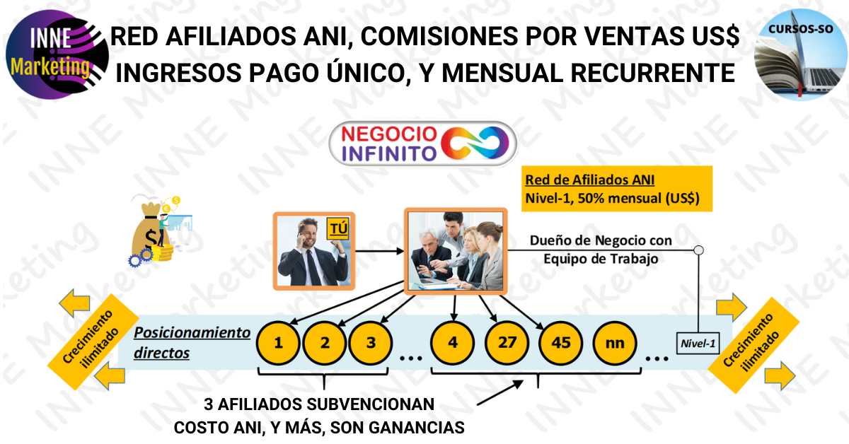 Y entre tal variedad de oportunidades, los participantes podrán generar ingresos por comisiones del 50% o más, de pago único, por la venta de Productos Digitales y de pago mensual y recurrente por la venta de la ANI, en dólares, lo que podrá otorgar la capacidad gradual de mitigar el pago mensual de la academia, y con 3 afiliados a la ANI, lograr auto solventarla y consumirla gratis, y con 4 a más afiliados, estar obteniendo ganancias incrementales, como ingresos pasivos.