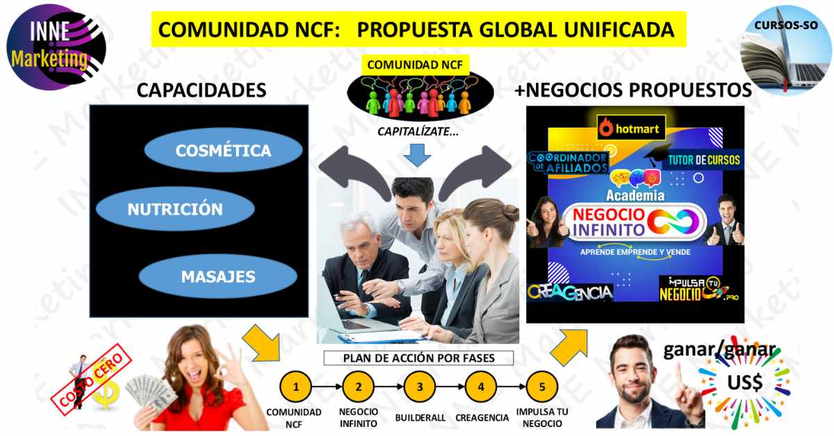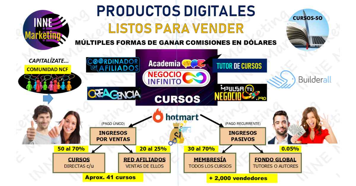 Al respecto, la propuesta de INNE Marketing y la Academia de Negocio Infinito aprovechan el potencial del negocio impulsado por Hotmart en la venta de Productos Digitales, y nuestra estrategia fortalece la capacidad de atenderla al 100% vía Internet, para lo cual te ofrecemos inducción y asistencia técnica para tí, y quienes te acompañen en tu Equipo de Trabajo, siguiendo los pasos de 1 Plan de Acción, afianzándose a un proceso de resultados progresivos, en comisiones de hasta el 70%, solo por ventas efectivas, y por consiguiente, si quieres tener ingresos, hay que tomar acción, con compromiso y convicción en querer tener éxito.